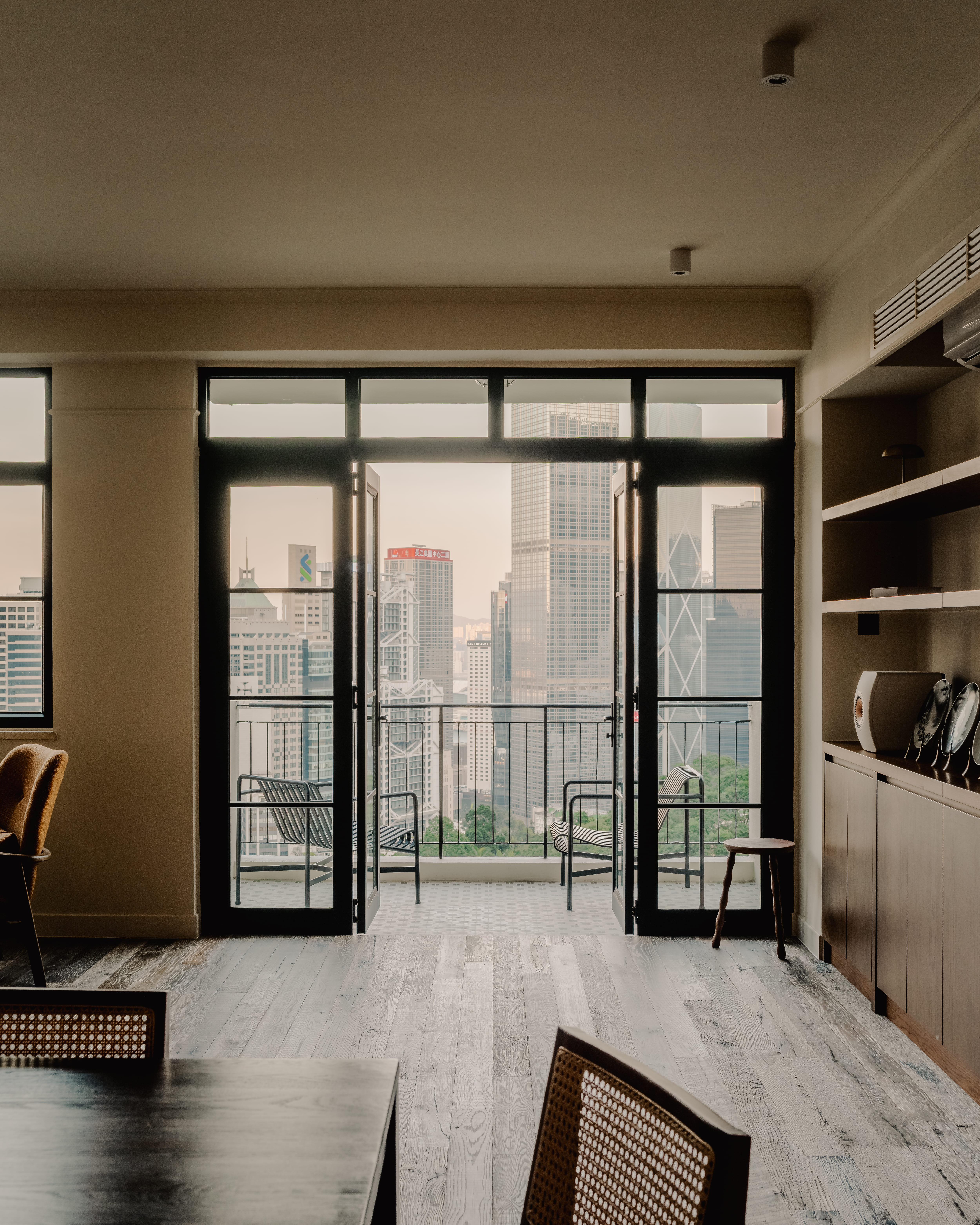 Structural constraints can also shape spatial identity. At The Roberts, a Mid-Levels apartment located in Hoi Deen Court, existing structural beams were integrated into the design to form arched portals between spaces. These elements establish a rhythm throughout the apartment while maintaining the integrity of the original structure.